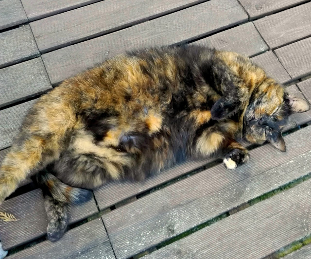 Většinu času na zahradě prospí anebo se jen tak povaluje a často mění místo.